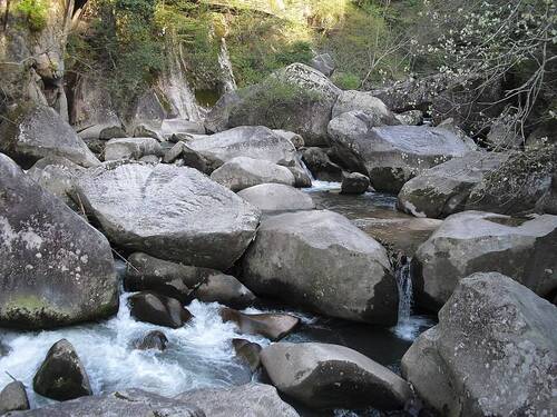 若き乃木卓が川辺で勉強するシーンのロケ地。黒雲母の花崗岩を削った奇岩群が続く渓谷で、遊歩道や吊橋(恋吊橋)が整備され、自然美とドラマの記憶が交差する場所です