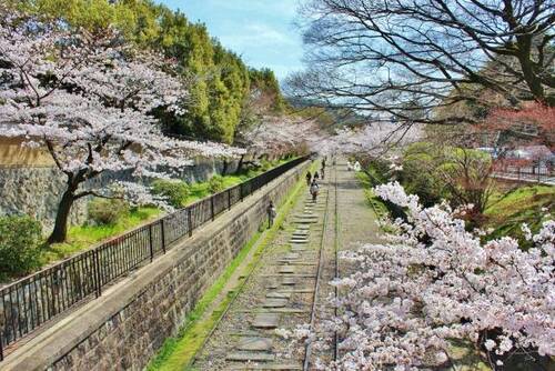 明治時代に建設された全長約582mの傾斜鉄道跡「蹴上インクライン」。現在は遊歩道として整備され、線路の上を歩くことができます。『四畳半タイムマシンブルース』でも登場するように、この場所は“過去と現在”“選択と後悔”が交錯する象徴として描かれています。春には桜が線路沿いを彩り、幻想的な風景が広がるため、訪れる時期によっても違う物語を感じられます。