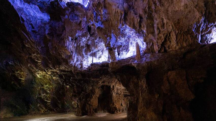 標高約900 メートルに位置する観光鍾乳洞。洞内は年間通じて約12 ℃前後という、夏場には避暑にもなる空間。石筍・石柱・らせん状の鍾乳石など自然の造形が圧巻で、地底の世界を探検するようなワクワク感もあります。